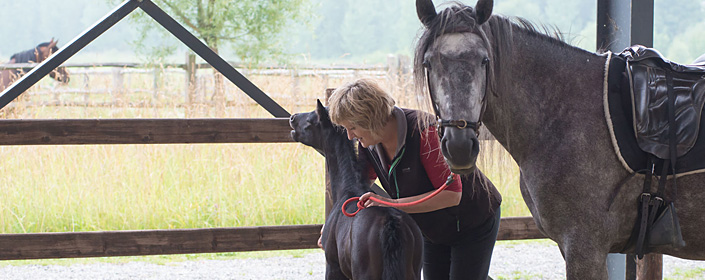 Veulens leven dag en nacht buiten in de merriekudde het hele jaar door. Vanaf de geboorte leren ze de mens kennen als respectvol en veilig, met duidelijke grenzen en leiderschap. Vanaf de derde week gaan ze mee uit rijden met de moeder op het domein. Ze hollen, springen en genieten telkens van dit uitstapje. Wat later gaan ze gehalsterd mee in het dorp en leren auto’s, tractoren, fietsen kennen. Koorts nemen, hoefjes optillen, blijven stilstaan, halsteren, de mens volgen aan een touw... op 3 maanden kunnen ze dit.